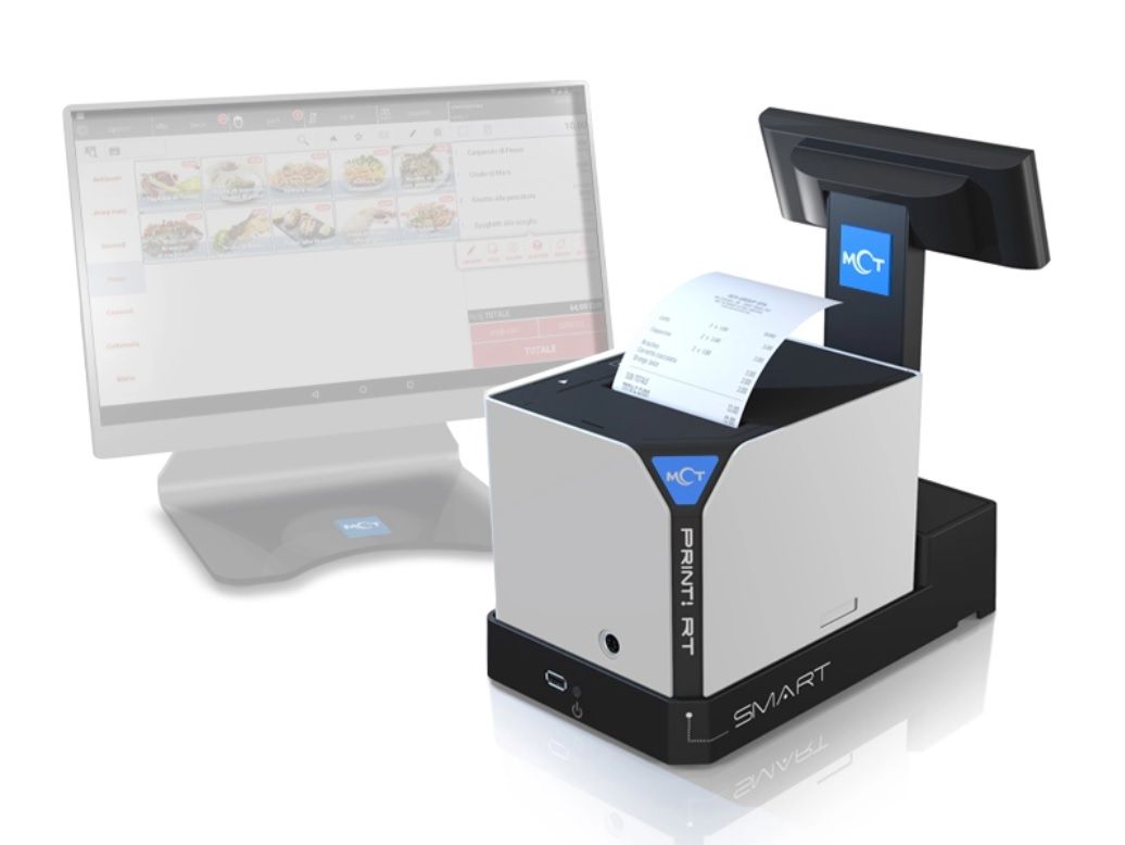 è il nuovo sistema di cassa Android di MCT. La stampante telematica poggia su una docking station che racchiude il Sistema Operativo Android 10, integrabile con il software MCT A-Touch System